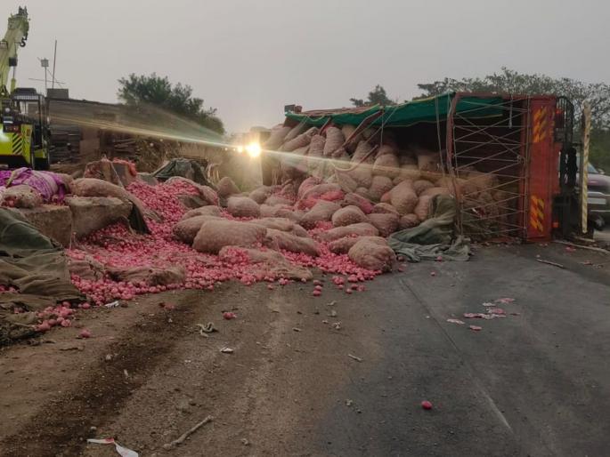 पुणे-बंगळुरू महामार्गावर कांद्याचा ट्रक उलटला; ५ किलोमीटरपर्यंत वाहनांच्या रांगा