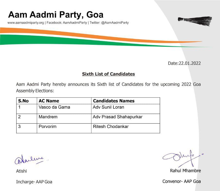 Delhi MLA and Aam Aadmi Party Goa desk in-charge Atishi tweeted, “Happy to announce the sixth list of candidates for the Goa Assembly elections, 2022. Congratulations and best wishes to all the candidates”.
