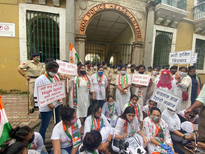Panaji: Goa Mahila Congress on Thursday demonstrated outside Goa Police Headquarters regarding the vulgar video clip posted through deputy chief minister Chandrakant Babu Kavlekar’s phone. Coutinho slammed government authorities saying, “Tarun Tejpal was arrested based on an email. In this case however, there is proof of a vulgar video being circulated but no arrest. Babu Kavelkar has alleged that his phone was hacked through which the video was sent but today the govt. machinery has completely failed because they cannot find out who hacked his phone.”