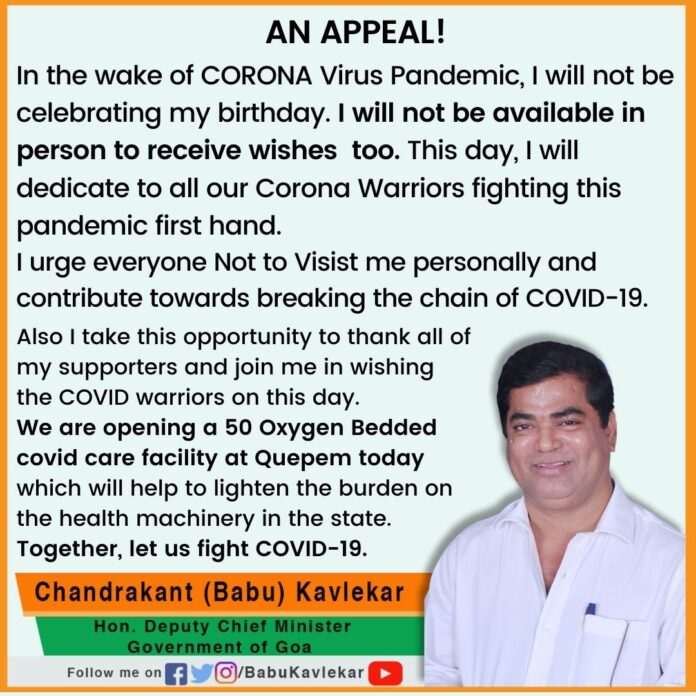Quepem: Deputy Chief Minister Chandrakant alias Babu Kavlekar will open 50 Oxygen bedded covid care facility at Quepem on his birthday today.