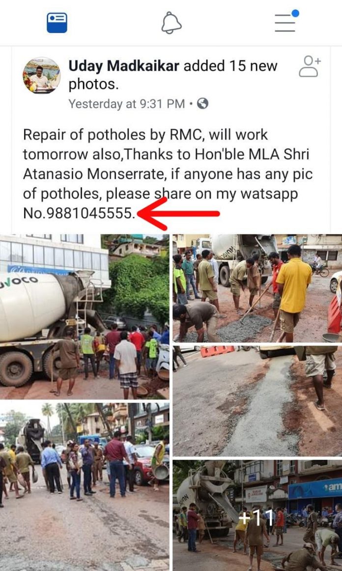 The Mayor posted on social media: Repair of potholes by RMC, will work tomorrow also, Thanks to Hon’ble MLA Shri Atanasio Monserrate, if anyone has any pic of potholes, please share on my whatsapp No. 9881045555.