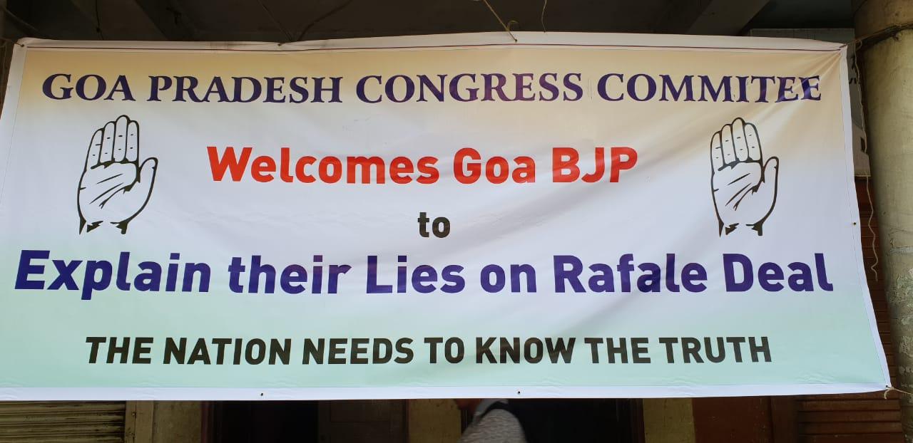“Goa Pradesh Congress Committee Welcomes Goa BJP to Explain their lies on Rafale deal. The Nation needs to know the truth,” reads huge banner installed outside Congress House Opposite Ferry point in the city.