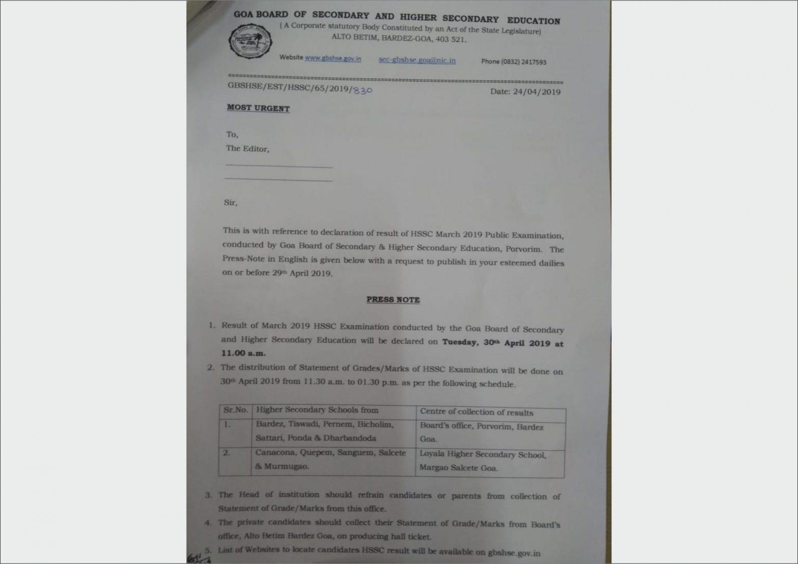 Goa Board of Secondary and Higher Secondary School Chairman Ramakrishna Samant said that the results of March 2019 HSSC examination conducted by the board will be declared on Tuesday, April 30 at 11 a.m.