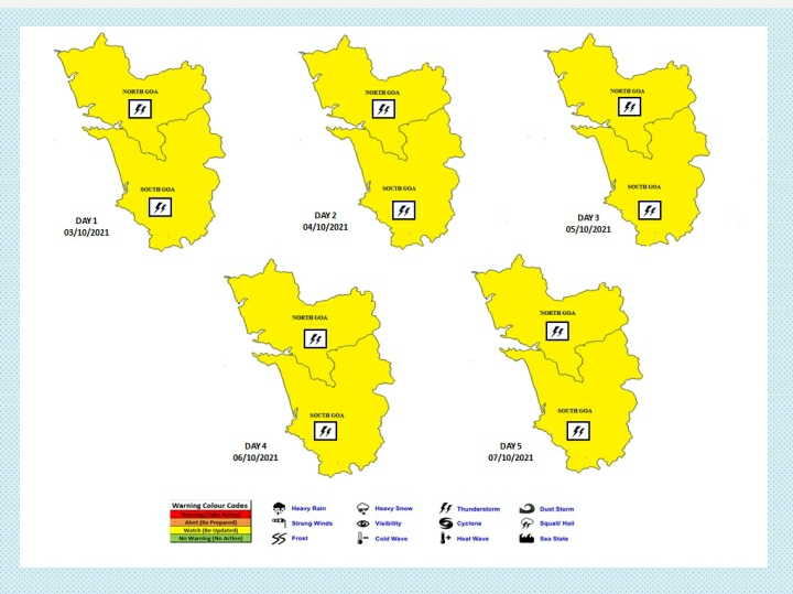 IMD Goa has issued a yellow warning for October 3,4,5,6,7. 2021.