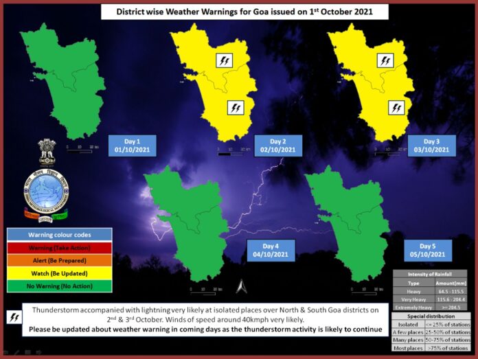 Panaji : India Meteorological Department (IMD) Goa has issued a yellow warning for the state of Goa on October 2 and 3. Thunderstorms accompanied with lightning are very likely at isolated places on the above mentioned dates.