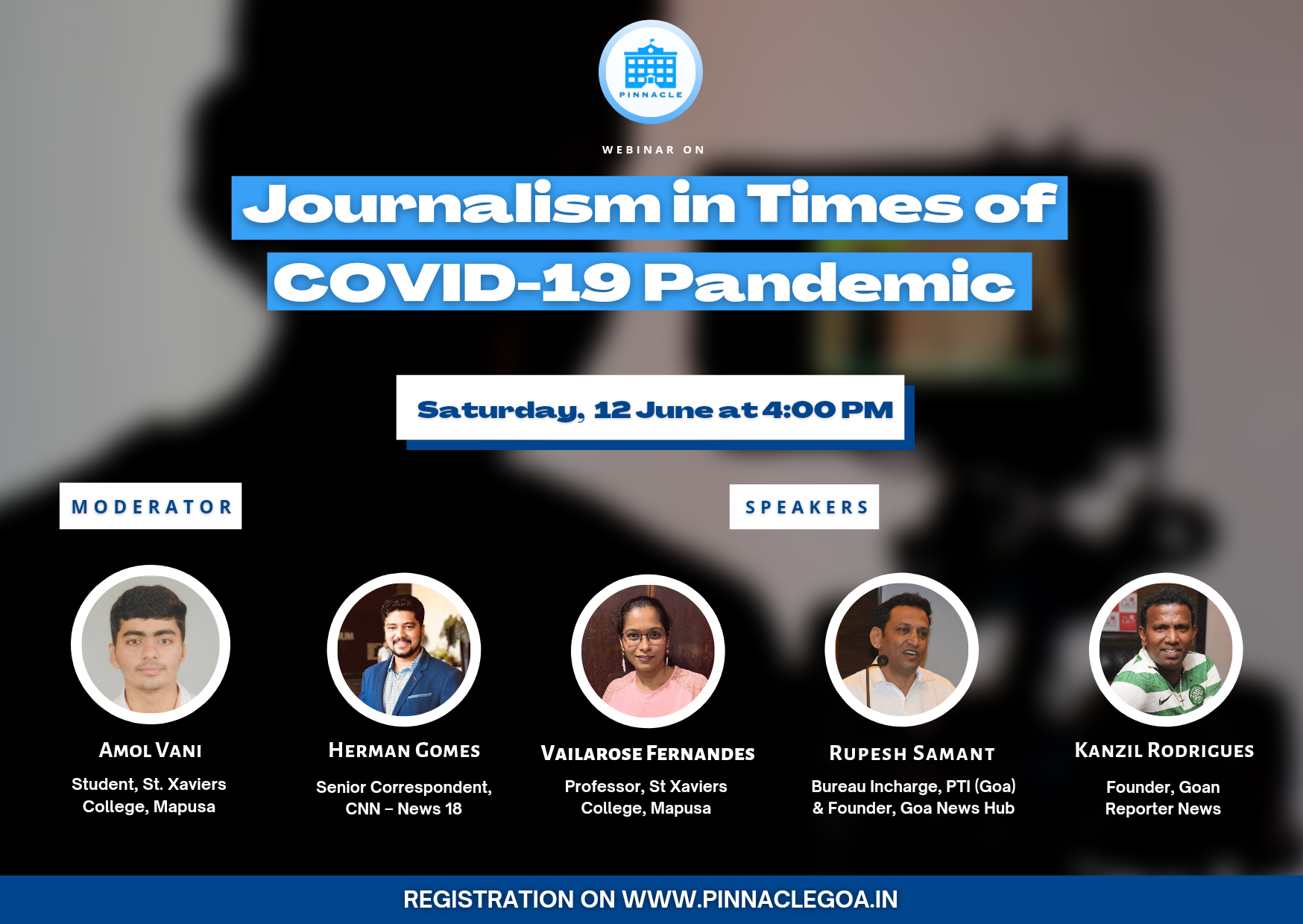 Pinnacle club of Goa University has organised a webinar on June 12th at 4:00pm on the discussion of ‘Journalism in times of Covid 19 Pandemic’ with speakers such as Herman Gomes (Senior Correspondent for CNN-News18), Kanzil Rodrigues (founder of Goan Reporter News), Rupesh Samant (Bureau Incharge for PTI, Goa and founder of Goa News Hub) and Vailarose Fernandes (Professor at St Xavier’s College, Mapusa).