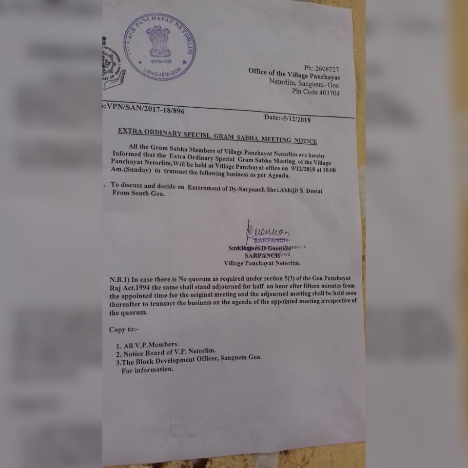 The notice which is displayed at the office of panchayat reads that all the Gram Sabha membes of Village Panchayat Netorlim are hereby informed that the Extra Ordinary Special Gram Sabha meeting of the village panchayat will be held at village panchayat office on December 9, 2018 at 10.00 am to transact following business as per Agenda.