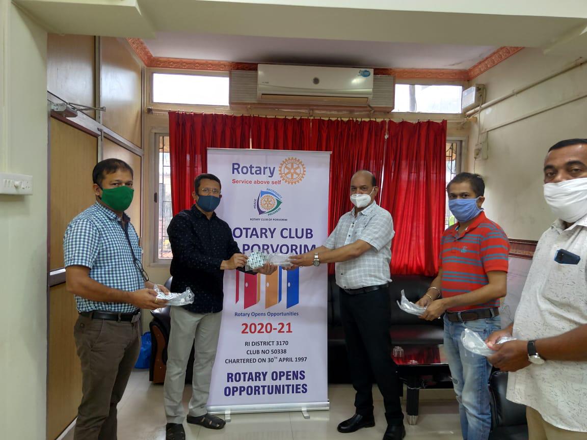 Rotary Club of Porvorim_has distributed Face Masks and Safety Glasses at Curchorem – Cacora Municipal Council. President Rtn Ramesh Tiwari and Rtn Kishore Sarsolkar handing over face masks and safety glasses to Chairperson Rtn. Balkrishna Uttam S. Hodarkar, Mr Deepak Dessai (Municipal Engineer) and Mr Dhiraj Sawant (AMI)