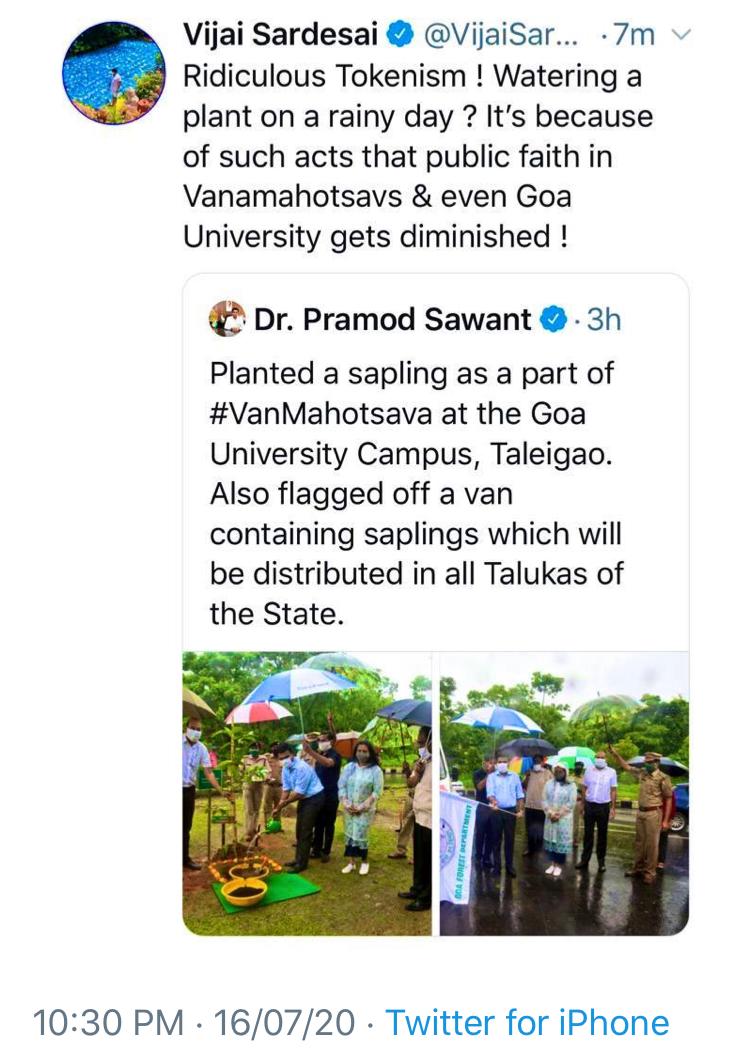 Reacting to the tweet, Goa Forward Party Chief Vijai Sardesai retweeted “Ridiculous Tokenism! Watering a plant on a rainy day? It’s because of such acts that public faith in Vanamahotsavs and even Goa University gets diminished.”